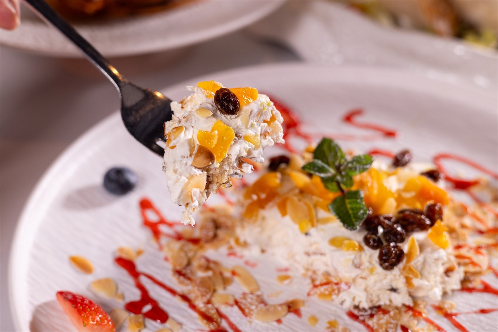 甜品師傅會先用橙酒Grand Marnier浸泡杏脯、提子乾,再加入烤杏仁片煮成鳥結糖狀態,最後要打勻忌廉蛋白做出綿滑軟糯口感。好鍾意佢哋為香港人度身製作嘅減甜版本,連埋滑膩蜜糖一齊食,甜度啱啱好。