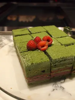 抹茶奶凍口感很幼滑,茶味濃郁帶點回甘,質素不錯。抹茶蛋糕是廚師極力推介,朱古力脆餅,抹茶慕斯,榛子醬及蛋糕梅花間竹交疊著,這四角戀愛帶來的口感,錯中複雜,令人吃得心花怒放,不過胃納開始受不了,只淺嘗一點,又趕著試別的甜品去...
