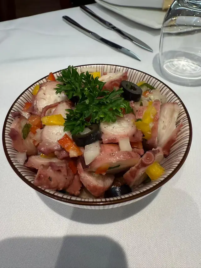 前菜章魚沙拉,八爪魚粒大大粒,咬落彈牙得嚟完全唔韌,配橄欖油、洋蔥同甜椒,清新開胃,作為第一道菜即刻好開胃🤤。
