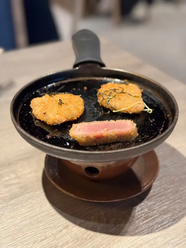 和牛西冷用自家調配粉漿高溫快炸60秒高溫炸,食起上嚟非常粉嫩🥰大約已有三成熟,職員話可以用鐵板爐再煮熟自己調配🔥 御膳嘆勻和牛四款唔同部位嘅牛肉,包括肉味濃郁嘅穀飼西冷、油脂豐富嘅醬味薄牛、口感軟腍嘅翼板牛同埋最稀有嘅菲力牛😍每款都有獨特口感同牛味💕最正係可以配上溫泉玉子🐣將滑溜嘅蛋液撈埋一齊食,口感更加順滑,瞬間由和風變洋風,正到暈💫而青唐辛子味則帶點微辣清新,係另一種層次嘅享受🫰🏼