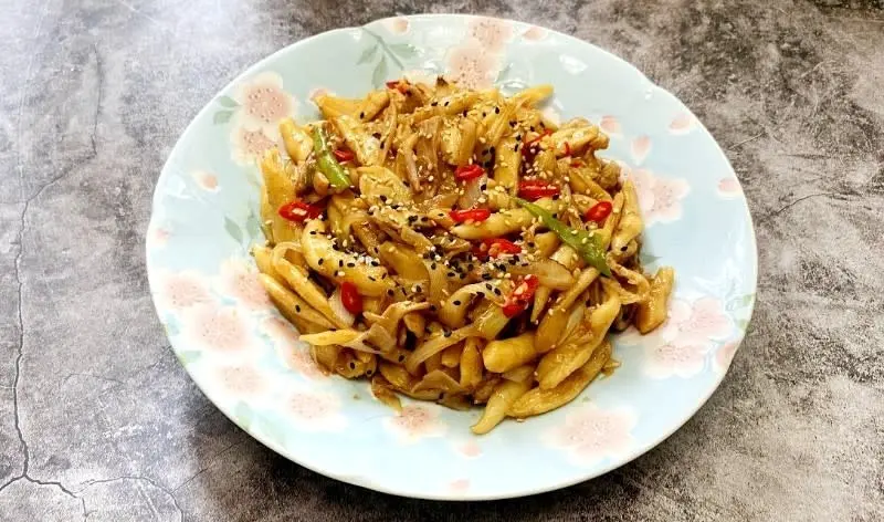 3. 燒熱鍋,下油,先用中火爆香洋蔥和大蔥,再加入雞髀菇和切小段的豬肉片同炒,加入剪刀麵,倒入已混合好的醬汁,轉中大火快炒至收汁。