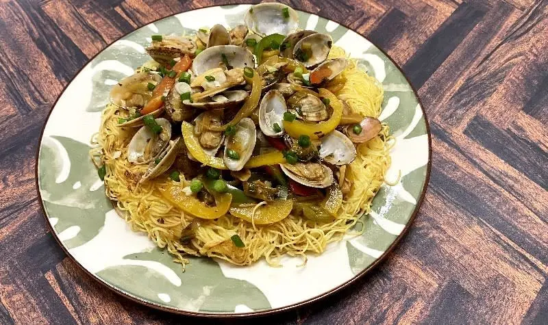 3. 加入蜆同炒,下調味,炒勻後加三色椒再快炒,下芡水收汁,把蜆連汁鋪在麵上。