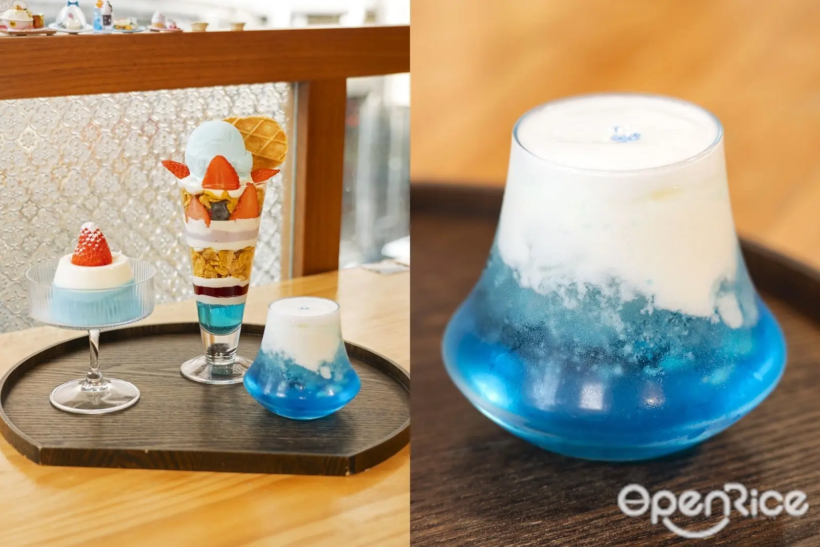 婆婆珈琲屋的甜品都融入了日本富士山元素,首選色彩繽紛的富士山芭菲,加了沖繩海鹽雪糕、戚風蛋糕、厚滑奶蓋、藍莓乳酪、粟米片脆脆等,口感豐富。至於粉藍色的富士牛乳布丁外形似迷你版富士山,可愛造型至適合相機食先!布丁入口香滑,奶香味濃厚,面層還有鮮紅的士多啤梨。