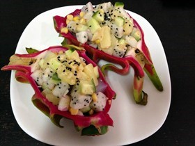 先將火龍果分開一半,將果肉拎出,再加入切粒青瓜、切粒菠蘿及其他你喜歡的材料,我加左椰果、粟米、芝麻醬、幾粒黑芝麻裝飾,完成!