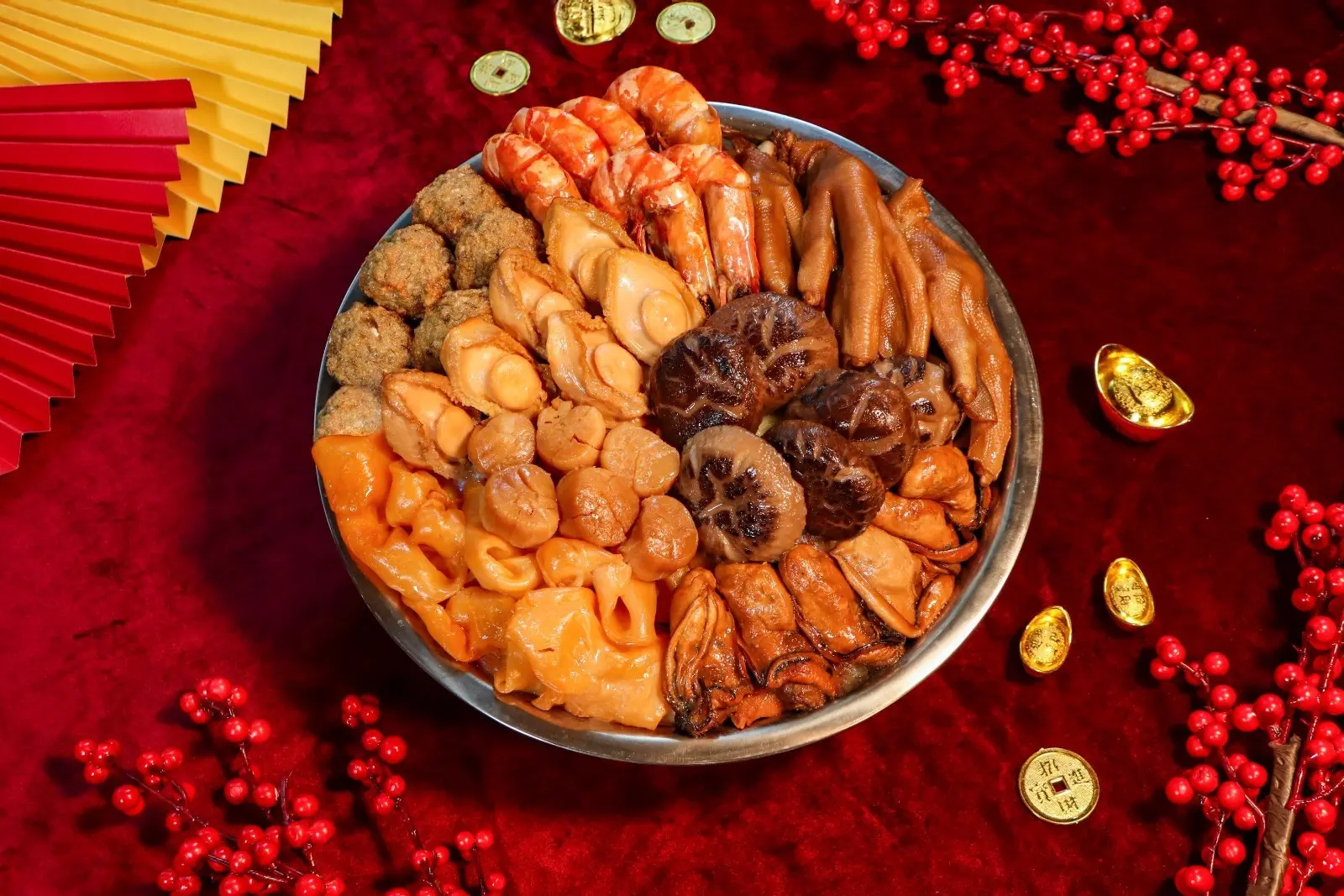 呢款盆菜走矜貴澎湃路線,有原隻6頭鮑魚、蠔豉、大蝦、花膠、鵝掌同瑤柱,再加手打鯪魚球、南乳豬手、燒腩仔同貴妃雞等。底層用枝竹、白蘿蔔同娃娃菜等吸晒南乳鮑汁精華,味道濃郁又夠傳統新年feel,就咁加熱就食得超方便!