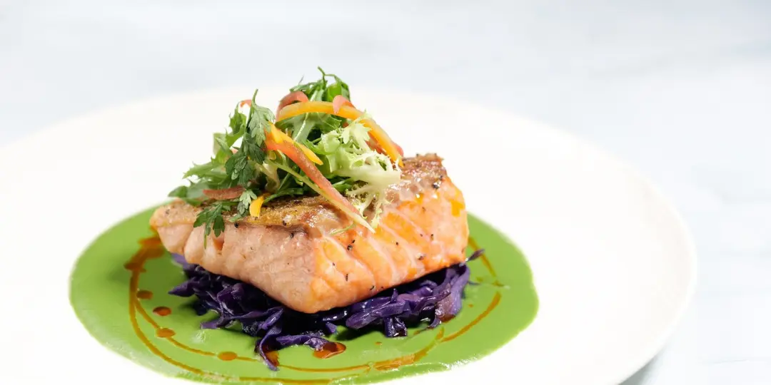 挪威三文魚、菠菜豌豆蓉、燴紅椰菜及紅椒粉油