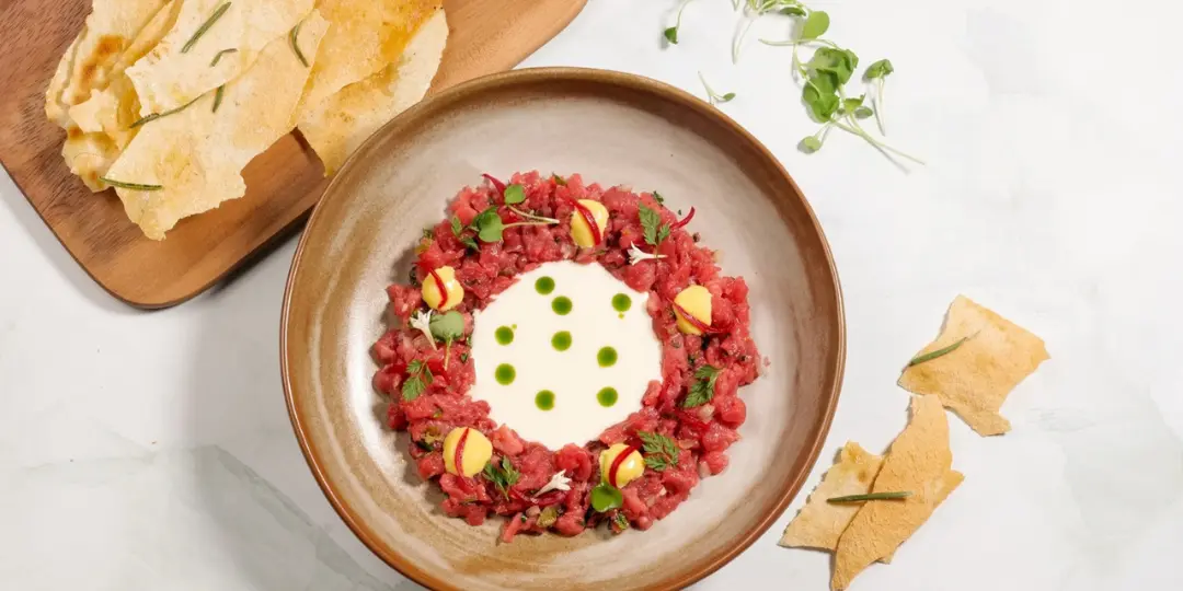 法松娜生牛肉他他配醃紅蔥頭、帕爾瑪芝士醬、芥末蛋黃醬及撒丁薄脆片