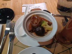 第三道菜,烏雞湯及鮑魚煲。烏雞湯好濃湯底。鮑魚煲鮮嫩,彈牙。