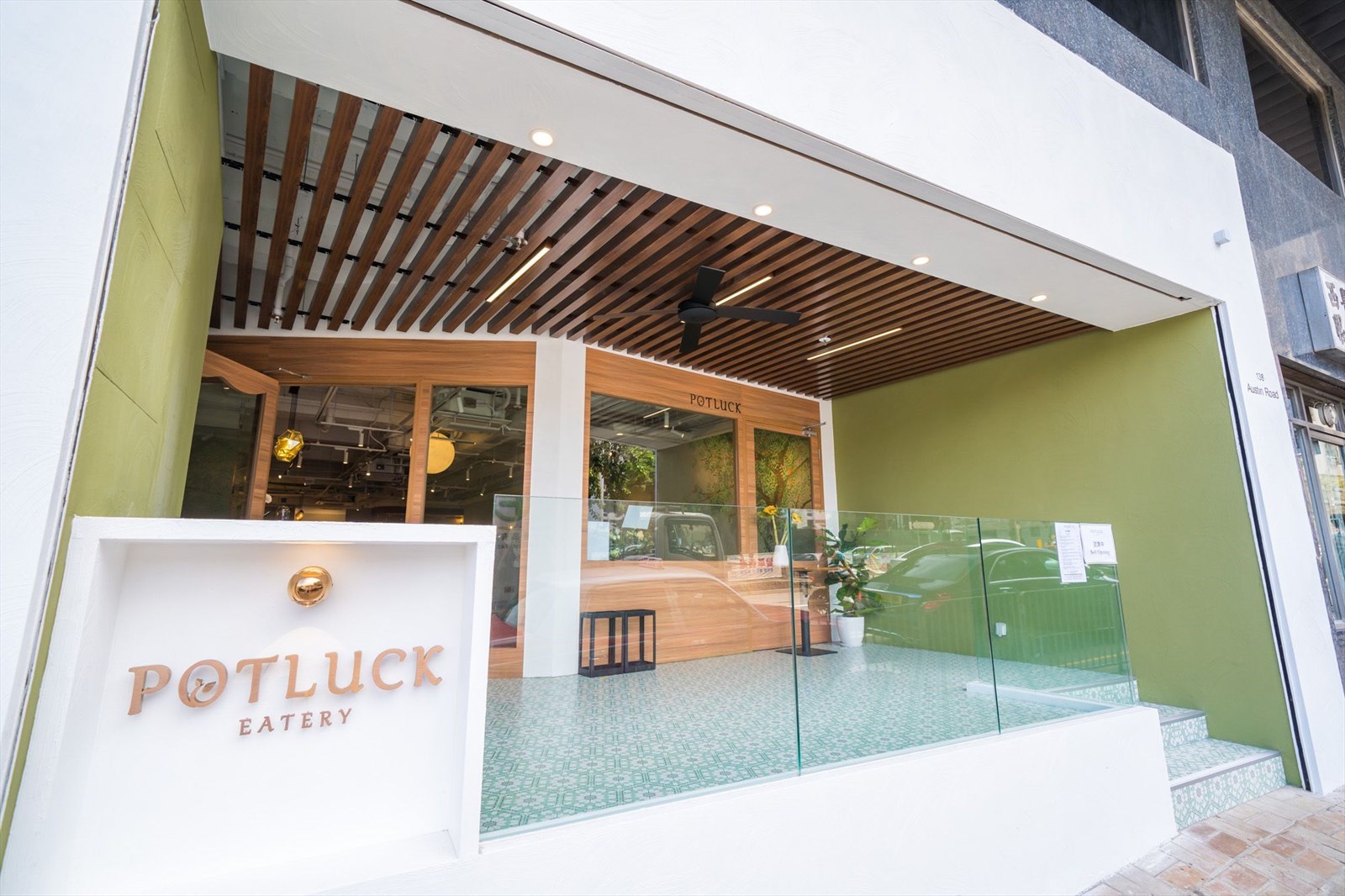 門口半露天空間,木門同綠色牆身有種復古美感。