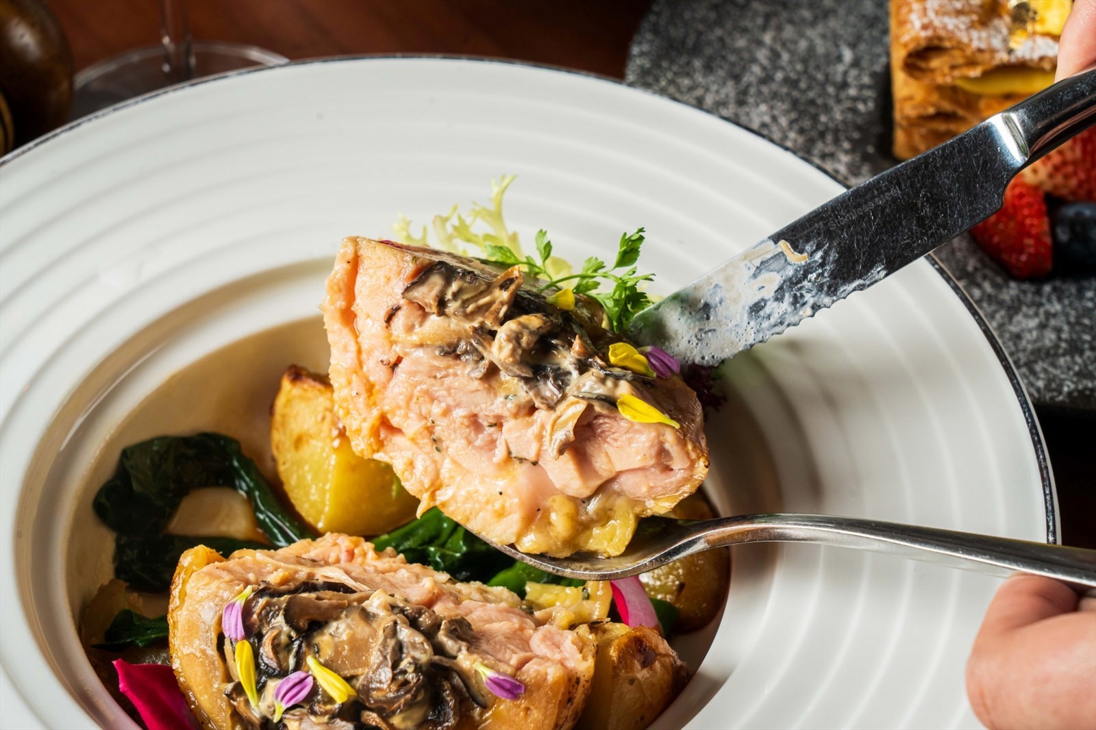 幾估唔到雞卷一切開就好濃雞味,因為Ryan用咗熬咗3日嘅雞汁煮,湯料嘅原雞、雜菜精華都喺晒度!! 而雞卷包住冬菇、白菌、巴馬臣芝士、忌廉芝士,抽真空低溫煮後,多重香味混合一齊幾正。
