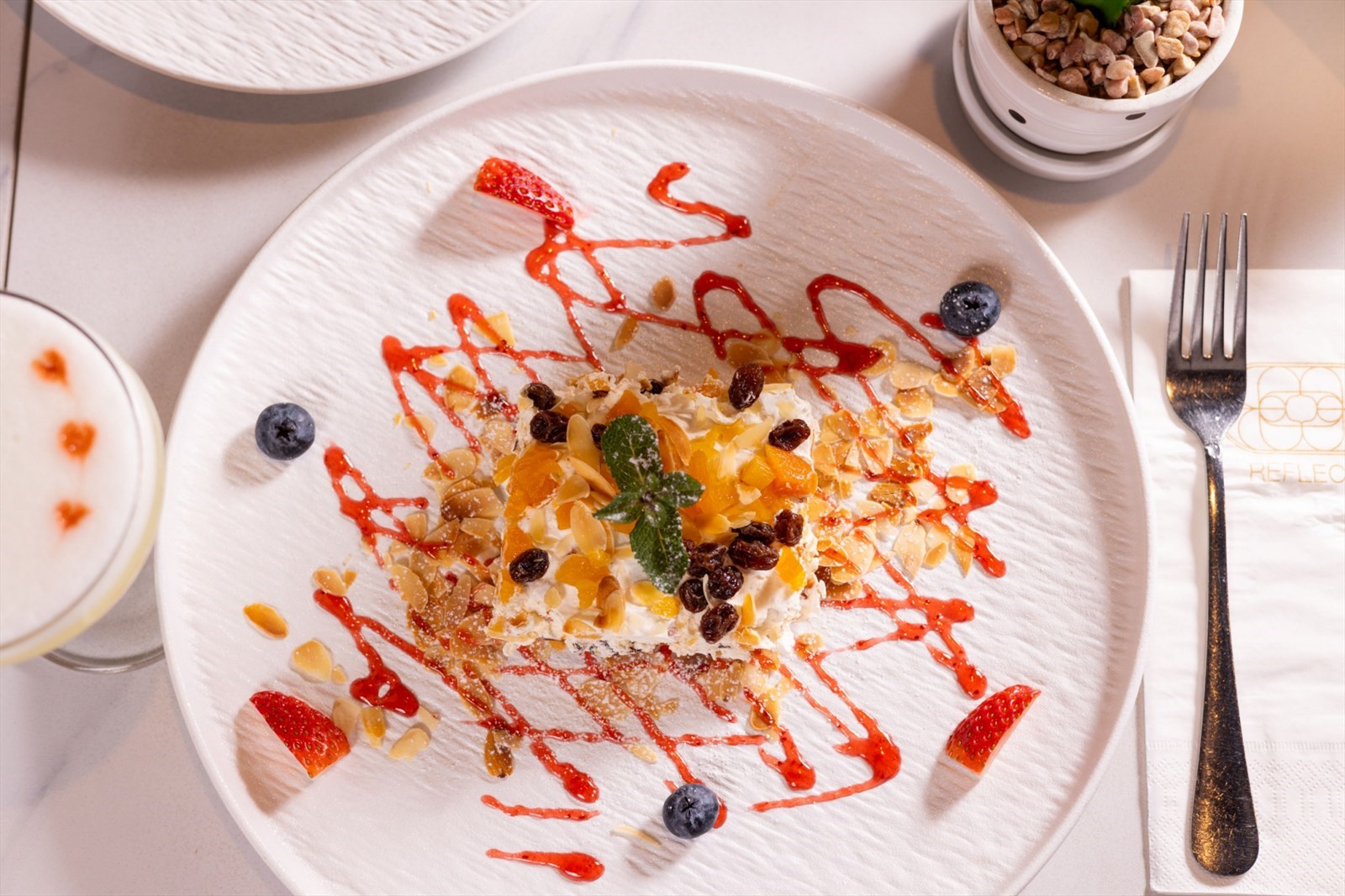 甜品師傅會先用橙酒Grand Marnier浸泡杏脯、提子乾,再加入烤杏仁片煮成鳥結糖狀態,最後要打勻忌廉蛋白做出綿滑軟糯口感。好鍾意佢哋為香港人度身製作嘅減甜版本,連埋滑膩蜜糖一齊食,甜度啱啱好。