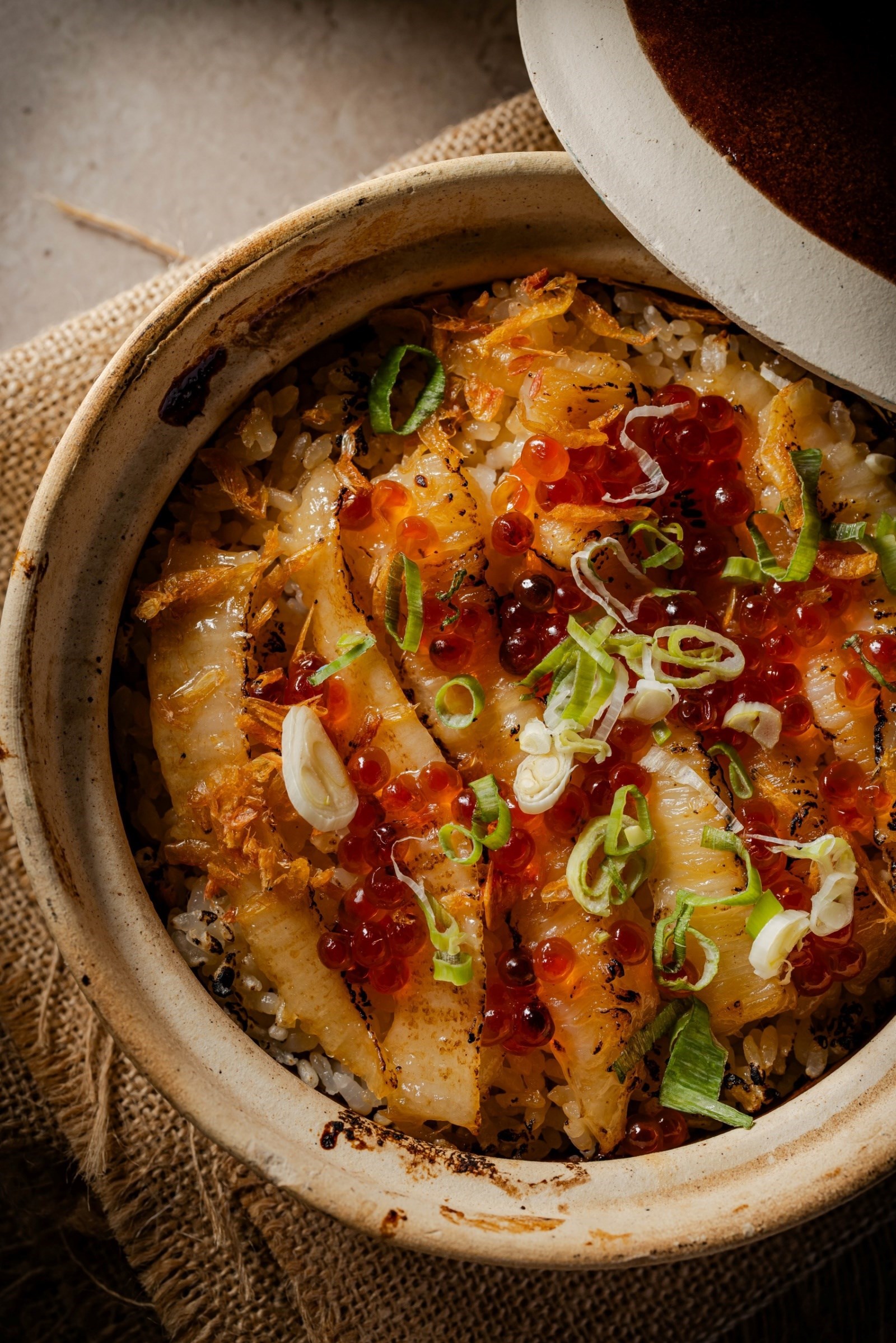 【左口魚邊櫻花蝦三文魚籽煲仔飯】