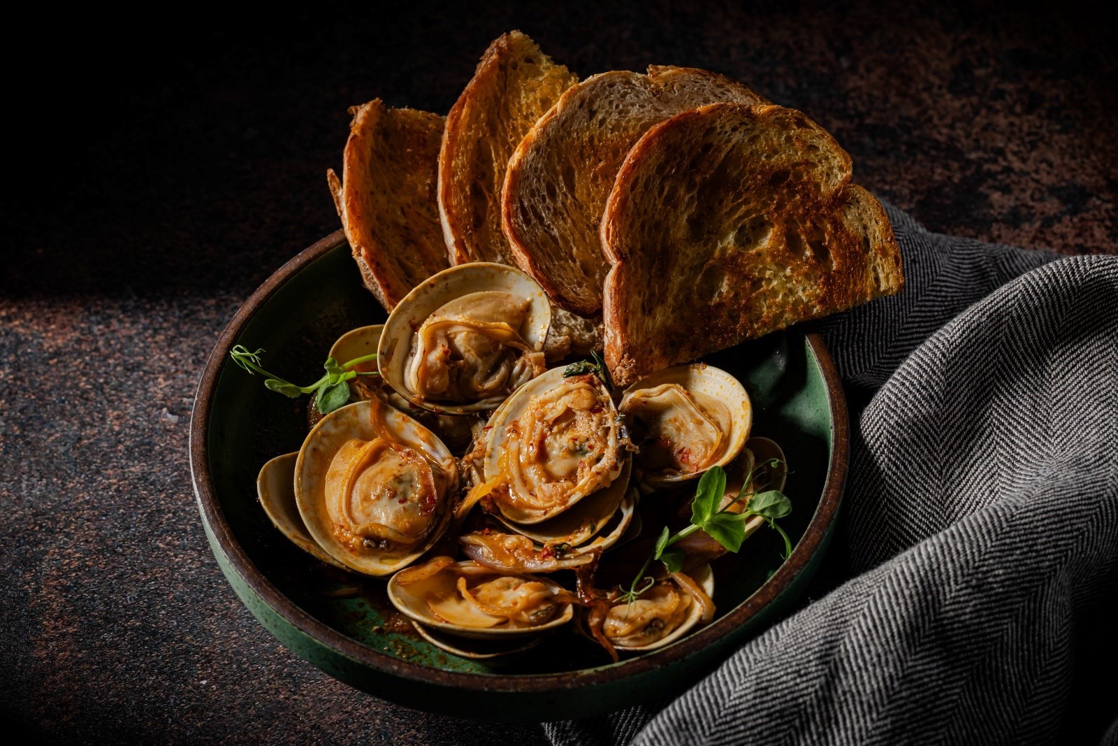 其實參巴醬嗰種辣得嚟惹味唔嗆口嘅風味,真係好啱飲酒。「J.moon」大廚就將參巴醬炒大蜆,直接用手拎起食,啜埋蜆殼嘅汁真係好吸引!! 另外跟配嘅酸種麵包都幾搶Fo,烘到脆卜卜,最後用嚟吸埋碟上嘅精華辣汁啦。