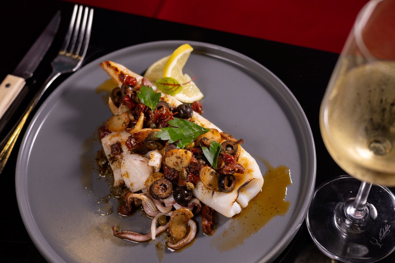 原隻魷魚煎到彈牙嫩滑,混合鹹香黑橄欖、酸甜乾蕃茄及鹹味龍葵。餘韻會滲出白酒與新鮮檸檬汁,有時又會食到番茜嘅清新,幾有地中海風味。